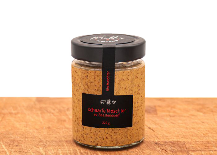 Cold milled mustard with a pinch of spice 100% organic The complete production of this mustard is on our farm Without adding flavoring, coloring agents, flavor enhancers or sweetener. Traditionnel recipe with verjus instead of vinegar.
